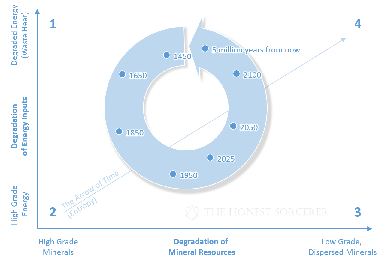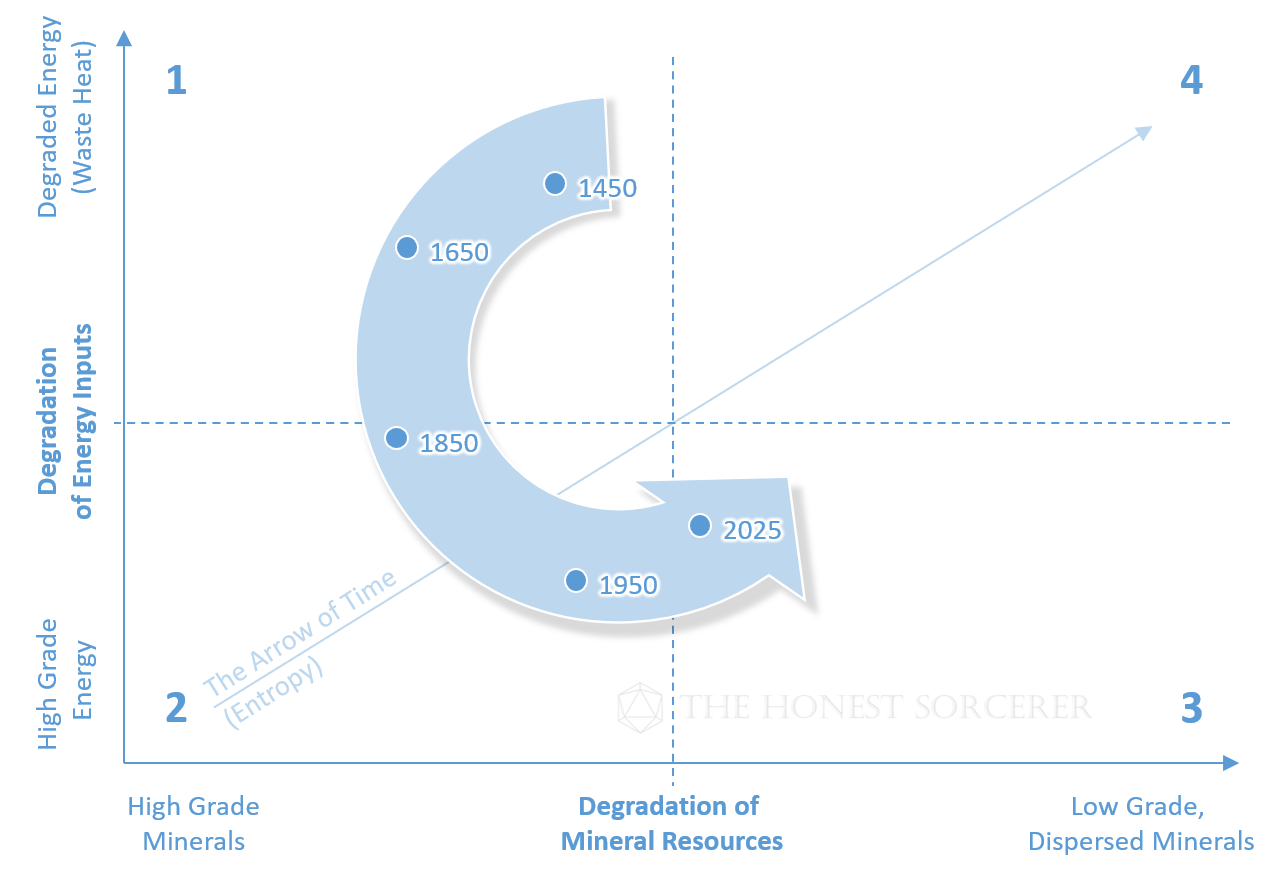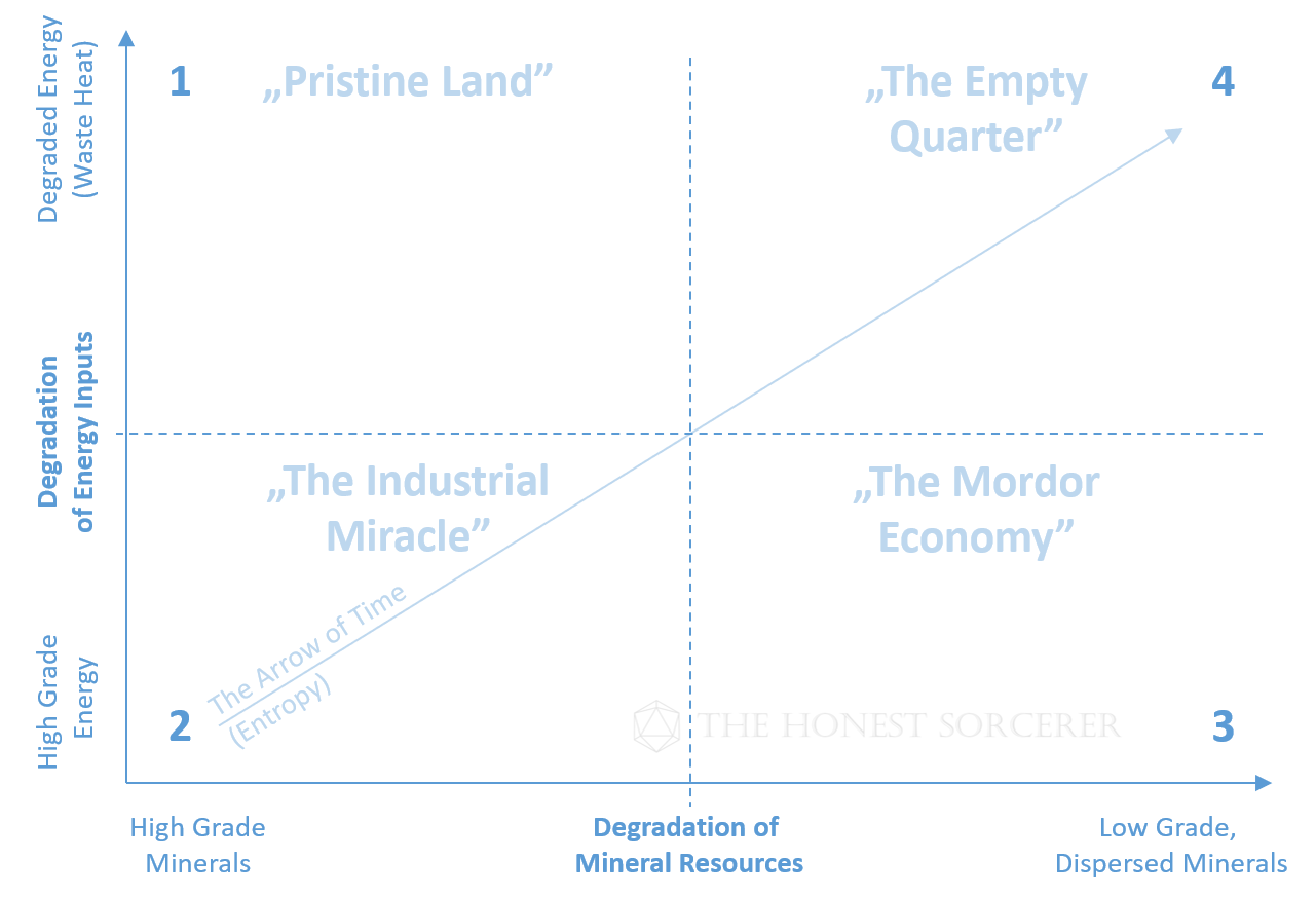 This framing using the energy gradient/entropy lens really clarifies why renewables feel like such a sideshow to the main event. The thermodynamics here are brutal, I've been thinking alot about that ore-to-metal ratio lately and how crazy it is we're celebrating the pivot to electrification while quietly processing 1% grade copper ores. The Mordor Economy label is dead-on though, feels like we're already in that quadrant and just haven't admitted it yet.