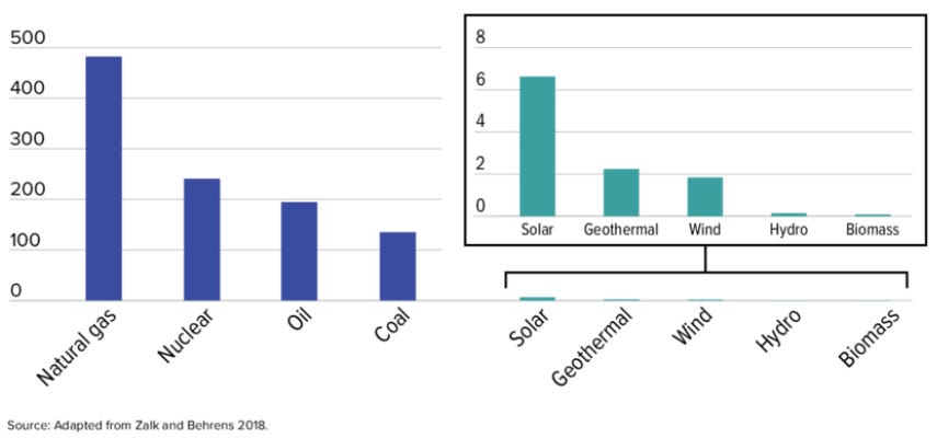 Now, compare that to an electric utility scale power plant, tapping into the immense heat gradient generated by burning concentrated, fossilized sunlight in the form of natural gas, or by splitting the atom 24/7. The difference is worlds apart. (And if you take all the conversion losses into account—as we convert sunlight into electricity at a pretty low efficiency still—the contrast is even more striking.) You see, degrading a high grade energy source (i.e. burning natural gas and turning it into electricity and waste heat) is easy. Upgrading low grade sunshine into something more valuable (electricity), on the other hand, is hard, costly, and material intensive. Just think of the massive undertaking of building dams, mines, smelters and six continent supply chains to make solar panel arrays, wind farms or hydro. This is why sunshine is for free, and why you have to pay so much for natural gas or electricity.