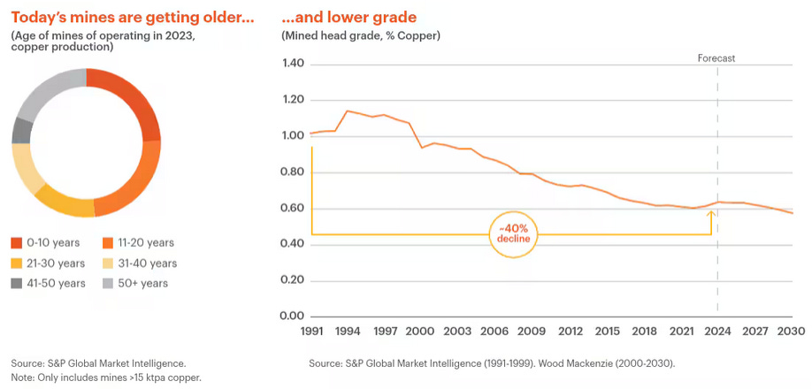 Most of the copper in circulation is already serving the needs of electrification, or used in applications where copper’s antimicrobial and heat conducting properties are essential. The lifecycle of these products is measured in years and decades, BHP assessed that the average life of copper in-use is around 20 years. So at best we could recycle what we have manufactured around 2005, when global copper production was half of what we see today… What’s worse, much of this old scrap is never recovered. According to BHP’s estimate only 43% of available scrap was collected and recovered for re-use in 2021, falling to 40% in 2023 as “lower prices, slowing economic activity and regulatory changes acted as headwinds.” And we haven’t even talked about the rise of “scrap nationalism, aiming to preserve the local use of secondary material, and placing restrictions on cross-regional waste trade.” Let’s be realistic, recycling won’t be able to fill the gap. At best, it can slow down the decline… Somewhat.