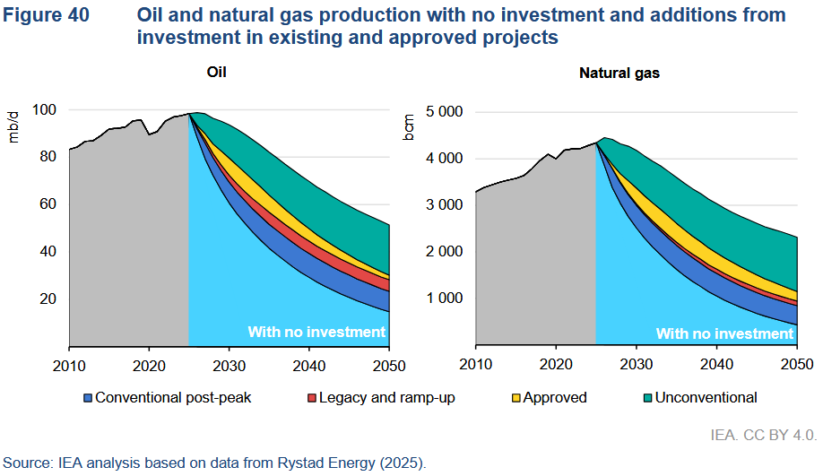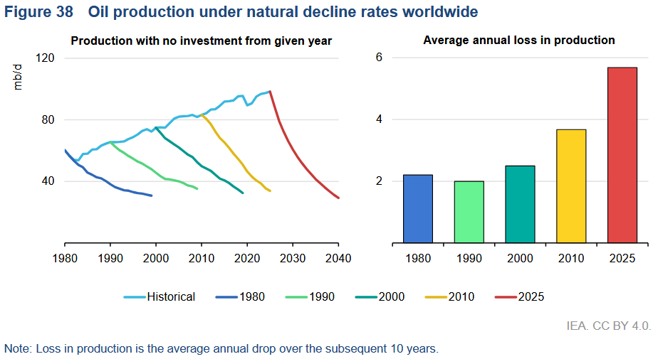 The real reason behind the peak and decline of fossil fuel use, as I pointed out several times, is not electrification. Turning coal oil and gas into battery electric vehicles and photovoltaic cells is a response to the increasingly limited growth potential of said fuels as well as an attempt to move air pollution outside the city and other densely populated areas. Going electric cannot help us get rid of these polluting fuels — only resource depletion can do that. Here, I came across another new report — just released by the International Energy Agency (IEA) — pointing towards an accelerating decline in fossil fuel production from existing wells.