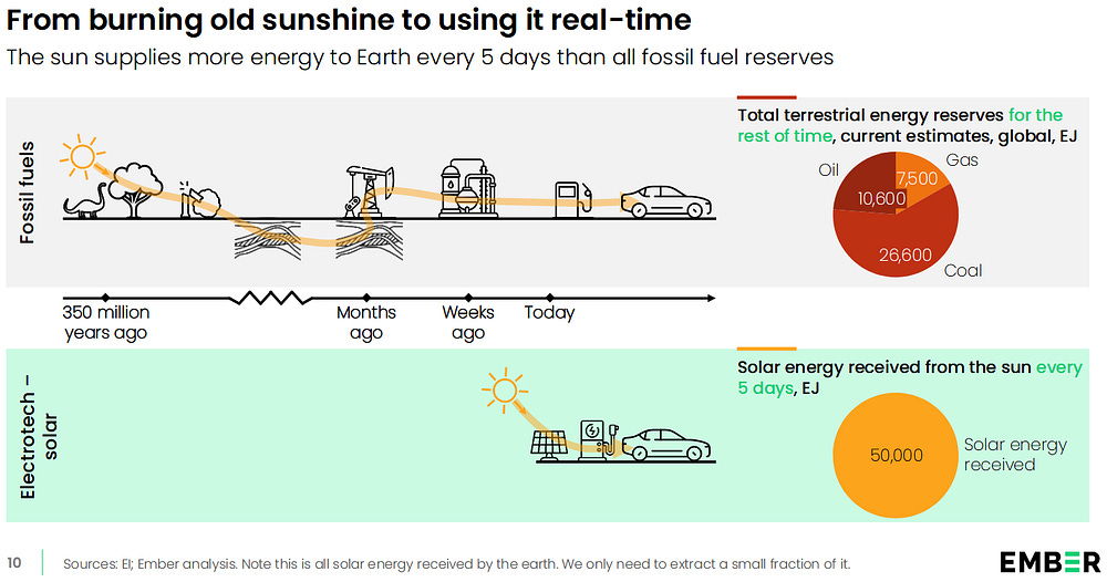 “Renewables” are in fact just a “smarter” way of burning those long dead plants and dinosaurs. Instead of using fossil fuels to generate electricity and motion at a 30% efficiency, we now increasingly convert coal, oil natural gas and Earth’s finite mineral reserves into solar panels and wind turbines hoping, that by the use of these devices, we could produce more energy than it took to make them. Making wind turbines and solar panels, however, cannot make us independent of fossil fuels, as the original image would imply — quite to the contrary: it just locks us more firmly in. So, just as we did not stop burning wood after coal came into the picture, or just as we kept burning coal after oil entered the scene, we will not stop burning fossil fuels — even if “renewables” were deployed en masse. With this fundamental piece of information missing from the Ember report, the whole electrotech vision turns into a navel-gazing exercise. To help us break out of this “electrotech” tunnel vision allow me to present you with a realistic version of the slide above: