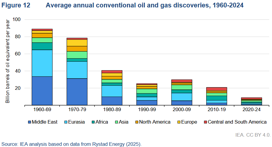 At the same time, and fully in line with the model runs shown above, we find less and less oil and gas every year. There is really not much left to discover: while we might and most likely find an oil field here and a field there in the future, these finds will be increasingly smaller and smaller: